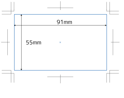 トリムマークをつけてください。 絵画ツールの「塗/枠」を色なしにして91x55mmの□を作成し トリムマークをつけます。□はガイドにしておきます。 |