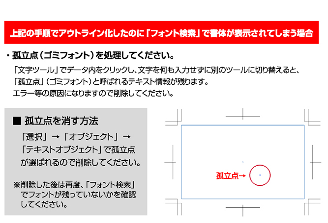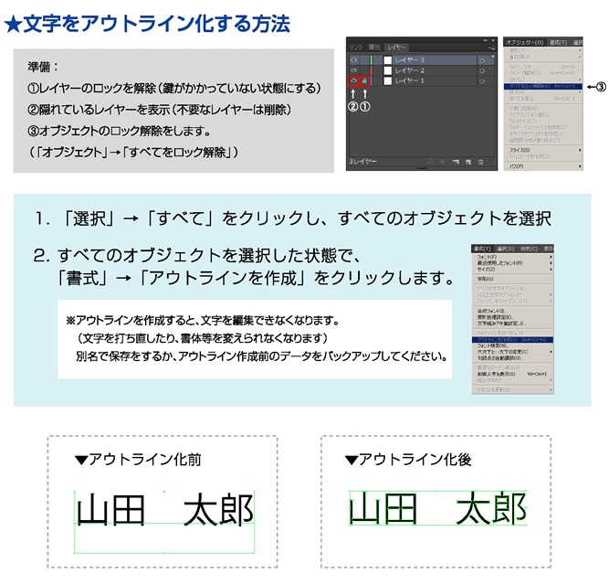 文字(フォント)を含んだデータを、作成したパソコンと異なる環境のパソコンで開くと文字が正しく 表示されないという問題が起こります。(別の書体に変わる、文字間が変わる、文字化けする、など) アウトライン化がされていないと、データ不備となり、再入稿をしていただく必要があるため納期が遅れる事がございます。