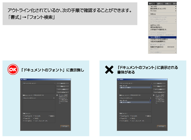 文字をアウトライン化することにより、文字が使用書体のまま図形化され、形を崩すことなく印刷が可能となります。