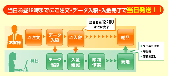 - ※ご入金・ご入稿締切時間は午前中までとなります。前日の締切時間から当日の締め切り時間までのご入稿時間順にデータ確認を行っております。データに不備等のある場合は、当日出荷処理の完了後、もしくは翌日の対応となりますので予めご了承ください。